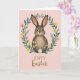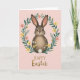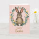 This card features a soft-furred rabbit with a gentle, inviting gaze, its rounded brown‑gray body and fluffy white tail giving it a sweet, friendly presence 🐰. The bunny sits calmly at the center of a circular ring of flowers and leaves, like it’s being lovingly framed for someone special. Pastel pink blooms and sunny yellow flowers weave through rich green foliage, with a few slender yellow buds adding light, flirty accents 🌷. A blush‑pink background keeps the scene calm and cozy, letting the tender look of the rabbit feel like a quiet hello to a close friend. Subtle shading along the rabbit’s face and belly adds depth, while the floral ring stays flat and graphic for a neat contrast. Near the bottom, a short Easter greeting appears in shiny gold lettering, centered and easy to read against the pale backdrop. The gold text sits beneath the wreath, with the circular garland hovering above like a soft halo of spring flowers. Tiny yellow buds peek out between the leaves around the circle, especially along the upper right edge.