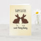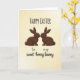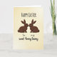 This card features a light, creamy yellow background that feels soft and sunny, with two rounded rabbit shapes in a deep chocolate-brown color placed in the lower middle. The rabbits face each other closely, their heads tipped inward as if sharing a quiet, affectionate moment 🐰. Gentle highlights on their smooth curves make them look like glossy candy, adding a sweet, cozy touch to the scene. Near the top, the words “HAPPY EASTER” appear in thick, hand-drawn uppercase letters, also in dark brown, centered over the pair. Under the rabbits, the phrase “to my sweet honey bunny” is written in a thinner, flowing cursive style in the same brown, aligned neatly beneath their bodies 🐇. Soft shading sits just under the rabbits, giving them a grounded look against the pale backdrop. The final detail is the subtle shine along the rabbits’ ears and backs, catching the light against the creamy yellow field.
