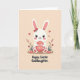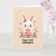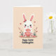 This card features a white bunny with long ears tipped with soft pink inside, sitting front-facing with a small matching bow near one ear 🐰. Its wide eyes with long lashes and a rosy blush on the cheeks and nose give it a tender, friendly look, as if it’s posing for someone it cares about. Held close in its paws is a large coral-colored egg decorated with small white flower shapes, like a gift being offered with quiet affection. Along the left and right sides, slim branches with green leaves and pale pink blossoms frame the bunny, adding a fresh spring setting 🌷. A few small red hearts float around the bunny on a warm beige background, hinting at romance or close friendship without needing any extra words. There is no visible text on the front, leaving the illustration to carry the message. Two smaller coral eggs with similar white floral details sit near the bottom edge beneath the bunny.