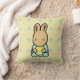 Throw Pillow with front facing image of a sweet baby bunny. This adorable bunny is wearing blue footed-pajamas with a light-yellow bib. Other sizes and materials available to match your decor. If you wish, change the background color (front and back) by clicking [Edit].