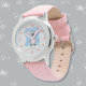 A cute pink watch for kids with an adorable cartoon gray koala bear . The numbers are a salmon pink color and quite big , making it easy for children to read . Personalize it with a name or remove it altogether , whichever you prefer .