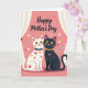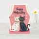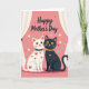 This card features two stylized cats on a bright pink background, posed close together as if sharing a quiet, affectionate moment ❤️. On the left, a white cat with a black collar dotted with small studs looks forward with wide golden eyes and a small smile, its body sprinkled with red and golden heart shapes. On the right, a black cat wears a golden collar and has a large pink heart on its chest, with a few smaller red hearts nearby that echo the theme of closeness. Soft, curtain-like shapes in a creamy off-white drape down the sides, giving the scene a cozy, stage-like setting. Near the top, a flowing headline in a dark ink color stretches across the space, with smaller lines of text placed beneath it in a lighter shade for contrast. Tiny hearts in red, yellow, blue, and white float around the words like confetti, adding a gentle celebratory touch 🌼. The overall look stays flat and graphic with minimal shading, and the cream drapes frame the two cats against the pink field.
