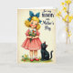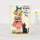 This design shows a young girl with golden curls tied back with a teal bow, her wide blue eyes and rosy cheeks giving her a gentle, affectionate look ❤️. She wears a coral-pink dress with white lace edging and matching red shoes, standing as if she’s about to offer something sweet to a close friend. In her hands is a freshly gathered bouquet of mixed wildflowers in lively reds, yellows, blues, and whites, held forward with careful, earnest posture. Beside her sits a sleek black cat, looking up at her with a devoted, trusting gaze that adds a quiet sense of companionship. The background is a soft creamy tone that keeps the focus on the figures, while a green strip of grass below is dotted with tiny blossoms 🌼. To the right of the girl, a short message appears in flowing, elegant lettering, set in a dark ink that contrasts clearly against the pale backdrop. Fine details show the smooth folds of the dress, the individual flower petals, and the cat’s glossy fur, with its small red nose and pointed ears standing out. Along the bottom edge, the grassy band runs horizontally with scattered little flowers spaced like confetti across the green.