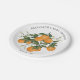Citrus themed paper plate featuring beautiful hand-painted oranges and greenery adorned with whimsical script lettering.