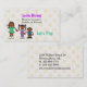 Whimsical mommy play date calling card, done in a light tan and ivory polka dot pattern. Cartoon graphics of three dark skin kids, in colorful clothing, decorates the bottom left. Personalize the text, on the front and back, for yourself, as a mommy card, or for your child. Great way to stay in touch with other moms and arrange play dates, birthday parties, and baby sitting co-ops.