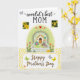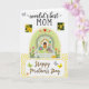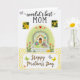 This card shows a cozy cottage garden scene framed by a soft, arched pastel green border sprinkled with small golden dots. In the middle sits a stylized little house with a brown door and a white arched trellis, wrapped in lavender blooms and leafy green vines that feel like a gentle hug ❤️. A white picket fence runs across the scene while soft brown rabbits linger near a yellow chick and a tiny white bird, their close spacing suggesting friendly, affectionate company. Pink and orange flowers fill the ground like a welcoming path, and small red hearts are tucked among the plants for a sweet, caring touch 🌼. Near the top, the phrase “–world’s best– MOM” appears in dark lettering, flanked on both sides by small rectangular photo-style images of bright yellow blossoms. A few butterflies in lime green, pale gray, and sunny yellow float around the garden, adding light movement above the fence line. Along the bottom, “Happy Mother’s Day” is written in flowing cursive over a band of golden yellow confetti-like dots that echo the dotted border. The trellis is bright white and neatly arched, with lavender flowers and green tendrils curling up its sides.