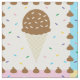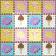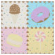 Satisfy your sweet tooth with this colorful pattern featuring tasty treats like a chocolate ice cream cone, a purple frosted chocolate donut, a lemon yellow macaron, and a pink and white swirled lollipop separated by chocolate chips and surrounded by rainbow sprinkles on four brightly hued squares.