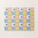 Satisfy your sweet tooth with this colorful pattern featuring tasty treats like a chocolate ice cream cone, a purple frosted chocolate donut, a lemon yellow macaron, and a pink and white swirled lollipop separated by chocolate chips and surrounded by rainbow sprinkles on four brightly hued squares.