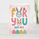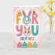 Designed with a large, friendly phrase in chunky letters, this card uses soft coral, warm goldenrod, and teal against a pink-and-white radiating background. Two of the letter “O” shapes become the faces of long-eared bunny-like characters 🐰, one in calm teal above and one in orange below, and their gentle, matching gazes suggest a sweet bond. The main text sits centered and oversized, with the letters outlined clearly so the colors stand out without feeling heavy. A tiny golden crown rests on the top of the first letter, adding a light touch of royalty. A small woven basket is tucked onto another letter, like a little gift placed right on the message. A slender champagne flute stem connects near the “Y” and the lower character, giving the layout a subtle celebratory detail 🌷. Along the bottom edge, four decorated egg shapes line up in a neat row with dots, stripes, and simple geometric patterns in coordinating hues.