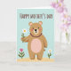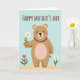 This greeting card shows a friendly, bear-like character in warm brown with soft pink accents, standing under a pale blue sky above a sandy, golden ground. The character’s gentle smile and rosy cheeks suggest a tender, affectionate mood, as if offering a quiet “thinking of you” moment ❤️. Around its neck sits a strand of deep purple beads, adding a small touch of dressy charm. One paw reaches forward with a single white daisy, its sunny yellow center and green stem standing out against the calm background 🌼. Two more flowers rise from the ground nearby—a pink bloom and another white daisy—creating a simple little garden scene that feels sweet and close. Near the top, a celebratory message appears in thick, hand-drawn lettering, colored in a reddish-brown that matches the character’s fur. The letters sit centered above the character, while faint line details on the paws and the daisy petals add texture against the flat color shapes.