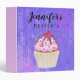 a BINDER with an illustration of a delicious looking cupcake. Pink frosting and chocolate drizzles. A yellow cupcake holder and a raspberry on top. Yummy! The background is a purple abstract texture with little hearts peppered throughout.