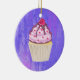 An ornament with an illustration of a delicious looking cupcake. Pink frosting and chocolate drizzles. A yellow cupcake holder and a raspberry on top. Yummy! The background is a purple abstract texture with little hearts sprinkled around.