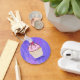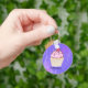 Keychain personalized with a name and designed with an illustration of a delicious looking cupcake. Pink frosting and chocolate drizzles. A yellow cupcake holder and a raspberry on top. Yummy! The background is a purple abstract texture with little hearts sprinkled around.