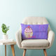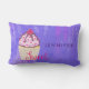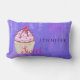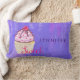 A personalized lumbar pillow with an illustration of a delicious looking cupcake. Pink frosting and chocolate drizzles. A yellow cupcake holder and a raspberry on top. Yummy! Text says Sweet The background is a purple abstract texture with little hearts sprinkled around.