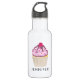 Water bottle personalized with a name with an illustration of a delicious looking cupcake. Pink frosting and chocolate drizzles. A yellow cupcake holder and a raspberry on top. Yummy!