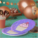 Paper plates with an illustration of a delicious looking cupcake. Pink frosting and chocolate drizzles. A yellow cupcake holder and a raspberry on top. Yummy! The background is a purple abstract texture with little hearts sprinkled around.