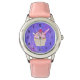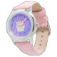 A watch with an illustration of a delicious looking cupcake. Pink frosting and chocolate drizzles. A yellow cupcake holder and a raspberry on top. Yummy! The background is a purple abstract texture with little hearts sprinkled around.