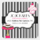 Stylish bakery business stickers done in a black and white striped background, with a black bold band, across the middle, and a decorative black edged white text area, on the front. Sweet graphics of a pink, white, and green cupcake and a cake stand with brownies, decorate the top and bottom, of the sticker. Personalize the pink and black text to suit your bakery needs.