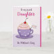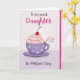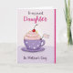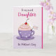 Designed with a sweet dessert illustration at the center, shown in a lavender teacup and matching saucer. The cup is dotted with small white polka dots, and it holds a tall swirl of soft pink frosting that feels like a gentle treat shared with someone close ❤️. A glossy red cherry with a slender stem sits on top, adding a bright pop of color against the pastel tones. A small pointed white flag peeks out of the frosting, decorated with tiny red hearts that suggest affectionate closeness. The background stays pale with faint dotted details, keeping the focus on the cup while still adding texture. The message “To my sweet Daughter” appears near the top in a strong pink-purple color, and “On Mother’s Day” is placed below the image in a deeper coordinating shade 🌼. Along the right edge, a vertical fuchsia strip with fine horizontal texture frames the scene.