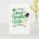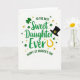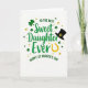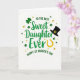 This design shows a white background filled with scattered green shamrocks and small gold stars that give the scene a light, festive sparkle 💚. Centered on the card is a stacked message in emerald green reading “TO THE BEST Sweet Daughter Ever HAPPY ST. PATRICK’S DAY,” with “Sweet Daughter Ever” set in a softer, flowing style that feels like a gentle squeeze of affection. The top line “TO THE BEST” sits above the larger middle words, while “HAPPY ST. PATRICK’S DAY” anchors the bottom, keeping the layout tidy and easy to read. Around the lettering, three-leaf and four-leaf clovers drift like confetti, adding little nods to luck without crowding the message ☘️. In the upper right corner, a black leprechaun hat with a gold buckle tilts in, like it’s tipping hello to someone you care about. Beneath the central text, a gold horseshoe with visible nail holes rests like a lucky keepsake placed there just for her. The gold stars are sprinkled between the clovers, and the hat and horseshoe stand out against the bright white space with dark black and warm metallic yellow tones.