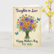 This card shows a digital illustration of a full bouquet centered on a softly textured cream background, with a cozy, affectionate mood ❤️. The arrangement is packed with rich purple and bright orange blossoms, dotted with smaller yellow flowers that lean toward each other like close friends sharing a quiet moment. Layered green stems and leaves gather at the bottom, wrapped with a simple brown band that adds an earthy touch. Two blue butterflies hover on either side of the bouquet, angled inward as if drawn together in a gentle, romantic orbit. Near the top, the words “Daughter in Law” sit above the flowers in deep violet lettering, clearly separated from the artwork. Below the bouquet, “Happy Mother’s Day TO YOU” appears in forest green text, centered and easy to read 🌼. The petals have a stacked, cut-paper look with crisp edges, and the butterflies’ wings show lighter blue accents against their deeper blue outlines.