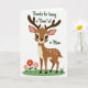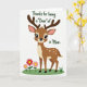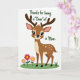 Designed with a simple, flat illustration style, the card features a young deer standing upright on a white background, giving a tender, friendly look that feels like a quiet thank-you ❤️. Its coat is warm reddish-brown with a cream belly and small white spots across its back, and it has large eyes with light lashes, a small black nose, and a gentle smile. Deep brown antlers curve up from its head, while the ears show soft pink on the inside for a cozy touch. A small patch of green grass sits under its hooves, dotted with three flowers—one red and two pink—each with a bright yellow center 🌼. A short line of green text sits above and slightly to the side of the deer, arranged in a flowing, cursive-like style that reads as a sweet pun about appreciation and love. The open white space around the figure keeps the focus on the deer’s warm expression and the message placement. The flowers are grouped near the bottom edge, with the red bloom on one side and the two pink blooms close by on the other.