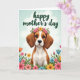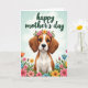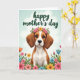 Designed with a soft, painterly touch, the front shows a sweet-faced dog centered in the scene, looking straight ahead with gentle brown eyes and long, floppy ears that feel quietly affectionate. A small crown of pink and yellow flowers with green leaves rests on its head, like a friendly offering ❤️. Its warm brown coat is set off by a bright white chest, giving the portrait a calm, cared-for look. Around the dog, a garden-like frame of blossoms fills the edges in coral, sunny yellow, sky blue, and shades of pink, with stems and leaves curling inward as if leaning close. The background fades into a pastel blue-green sky with faint white clouds, keeping the mood light and tender 🌼. Near the top, a short greeting is placed in deep green lettering, centered and easy to spot against the pale sky. The flowers appear in layered clusters along the lower corners, with a few small blooms reaching up beside the dog’s ears.