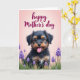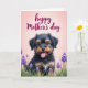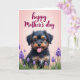 This card shows a fluffy dog centered in a close-up view, looking straight ahead with a gentle, friendly gaze that feels like a warm nuzzle ❤️. Its fur is richly detailed in deep charcoal with warm caramel and creamy ivory patches, and soft lighting gives the coat a cozy glow. Along the bottom edge, a strip of green grass adds a fresh spring setting, dotted with small bell-shaped flowers in a light lavender tone 🌼. The dog’s big brown eyes shine with kindness, and a small pink tongue peeks out as if it just trotted over to say hello. Across the top portion, the words “happy Mother’s day” appear in a flowing berry-colored lettering, standing out against a blush-pink background. The scene leans into quiet affection through the dog’s tender expression and the gentle, pastel color pairing around it. The grass blades and clustered lavender blossoms frame the lower foreground while the blush-pink sky area stays smooth and open behind the berry text.