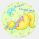 Sleeping cat is doing what cats do best - napping. This sticker coordinates with the stationery and invitation.. She is wearing an adorable pink top with stars and aqua striped sleeves. The moon is hanging above sleeping kitty, watching over with a smile. Kitty also has a blissful smile so you know that he is having sweet dreams. Text of “Sweet Dreams” is on a lime green background sprinkled with yellow stars and pink dots. The image is enclosed with a colorful whimsy border. This yellow kitty cat is one of 10 cats from the fabric collection “Meow Meow” by Phyllis Dobbs.