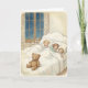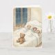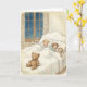 This greeting card shows a soft watercolor scene of two young kids asleep in a big bed, close together like they feel safe and cared for. The bedding is white, and the boy and girl have calm, relaxed faces with their eyes closed. On the left, a large window looks out to a dark blue night sky dotted with small golden stars. Light floral curtains frame the window, making the room feel warm and homey. A brown teddy bear with a little bow tie sits on the bed, and a rag doll rests beside the sleeping girl. On a nearby bedside table, there’s a small wooden duck on wheels, adding to the cozy bedtime setting. There isn’t any text shown on the front, so the artwork carries the message on its own—perfect for a gentle Valentine note ❤️💌🍫.