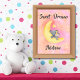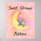 This is an adorable poster for the nursery of a baby girl or for a little girl's bedroom. The image is a baby girl elephant sleeping on a crescent moon surrounded by stars, with pink and peach as the main colors. This poster can be personalized by adding your own name and text to make it even more special.