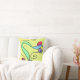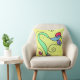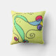 This artful pillow has a swirling drawing of a lady sleeping, dreaming sweetly. The background is chartreuse with bright pastels and black lines for contrast.