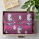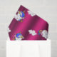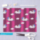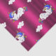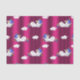 A pretty pink unicorn tissue paper, featuring a pattern of cute little rainbow unicorns, sleeping under big, white puffy clouds on a bright pink background.