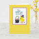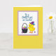 This greeting card features a bright yellow background with a centered white panel bordered in soft lavender and a dashed-line trim that resembles stitched edging. Across the top of the white panel, the message “To a SWEET girl on Easter!” appears in deep blue lettering, with “SWEET” in all caps for emphasis. Below the text, a round little yellow bird stands facing slightly toward a dark basket, giving the scene a friendly, affectionate closeness 🐰. The bird has small dark eyes, a tiny orange beak, and a tall purple cone-shaped hat topped with a teal flower, while one wing lifts as if offering the greeting. Next to it sits a sturdy, dark-colored basket with an arched handle, tied at the front with a violet ribbon that echoes the hat. Inside the basket are smooth egg shapes in pastel pink, green, blue, and a touch of yellow, suggesting a shared springtime treat 🌷. Small five-petaled purple flowers are scattered across the white panel around the bird and basket.