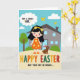 This card shows a sunny spring scene with a smiling young girl centered in the design, her rosy cheeks and gentle gaze giving the moment a friendly, affectionate feel 🌷. She has dark flowing hair with a bright yellow headband decorated with small flower shapes, and she wears an orange dress patterned with yellow blooms. At her side sits a small brown rabbit with pink inner ears 🐰, posed close like a quiet companion sharing her attention. Behind them, a cozy gray multi-story house with light blue windows and a matching door peeks out from behind a leafy green tree and rounded bushes. The sky is a clear blue with soft white clouds, and two yellow butterflies flutter above to keep the scene light. A white thought bubble near the top contains the message “FOR A SWEET GIRL” in dark lettering, placed above the girl’s head. Along the bottom, large multi-colored letters spell “HAPPY EASTER,” with a smaller line beneath reading “MAY YOUR DAY BE BRIGHT...” in a lighter tone, set against the open foreground.