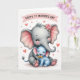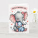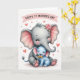 Designed with two sweet elephant-like characters on a bright white background, the scene shows a larger soft gray figure leaning in with a gentle trunk hug around a smaller light blue companion ❤️. The larger character wears a pink rose with tiny white flowers tucked behind one ear, and both have closed eyes and calm smiles that suggest a trusting, affectionate bond. Light pink shading warms their cheeks, while pale pink tones fill the inner ears and the foot pads for a tender, cozy look. Above them, a curved pink banner stretches across the top with a congratulatory message set in darker pink lettering. Small pink hearts float around the pair, echoing the closeness in their pose and the quiet joy on their faces 🌼. The smaller character adds contrast with a bright yellow bow tie centered neatly at the neck. Soft, diffused lighting and gentle shading give the characters a plush, textured feel, with the pink hearts scattered mostly to the sides of their embrace.