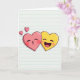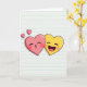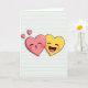 This sweet card shows two heart characters sharing a tender moment. A soft pink heart leans in with puckered lips and gentle blush marks, while a sunny yellow heart smiles back with happy, content eyes. Their expressions tell a simple story of affection and closeness. The background resembles lined notebook paper, with faint blue lines that add a cozy, handwritten feel.