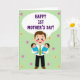 This card shows a cheerful, big-eyed dad figure facing forward with a wide smile and rosy cheeks, holding two tiny swaddled babies close as if he can’t stop admiring them ❤️. Each infant rests in an arm, their small grins and relaxed faces echoing his calm, affectionate attention. The babies are wrapped in bright aqua blankets that stand out against his white shirt and green tie, giving the scene a fresh, friendly look. Near the top, a rounded white speech bubble carries the main message in purple letters, centered so it reads first. The background is a light pastel green that keeps everything soft and gentle, like a quiet family moment. Scattered around are small flower shapes in pink and yellow, adding a springtime touch 🌼. Thin vertical stripes in black and white run along both sides, framing the illustration like a neat border. The flowers have simple petals with contrasting centers, dotted lightly across the green backdrop.