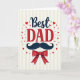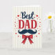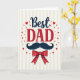 This card centers on a loving “Best DAD” message, with “Best” placed at the top in deep navy lettering and “DAD” set just below in strong red letters with small finishing strokes. The words feel like they lean toward each other, like a warm hug between parent and child 👨. Under the text sits a dark blue handlebar mustache with neat curled tips, giving the design a friendly, dressed-up look. Just beneath that, a bright red bow tie with small white dots adds a cheerful touch, like someone ready for a special day 👔. The background is filled with soft vertical stripes that alternate between pale cream and light beige, adding gentle texture without taking over. Small red hearts and tiny red dots are scattered around the center, as if they’re floating upward in quiet affection. The main message stays in the middle of the card, with the hearts and dots surrounding it to guide your eyes back to the words. At the bottom area, the red bow tie sits neatly aligned under the mustache against the cream-and-beige striped backdrop.