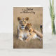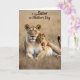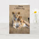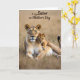 This design shows an adult female big cat resting in the foreground with her cub tucked close behind her, set against a sunlit, softly blurred field of golden grass ❤️. The adult’s calm golden eyes look outward with a steady, protective focus, while her body lies relaxed as if inviting the little one to stay near. Her coat mixes tawny gold, creamy highlights, and gentle brown markings that catch the warm light like early morning or late afternoon. The cub’s spotted fur and slightly tilted head create a tender, trusting look, and its soft gaze seems fixed on the adult as if sharing a quiet moment of closeness 🌼. One small paw rests lightly on the adult’s back, a simple touch that reads like affection without needing words. Across the upper portion of the image, a short Mother’s Day message appears in flowing dark lettering that contrasts against the bright background. The background stays painterly and out of focus, with sparse grasses fading into warm amber tones behind the pair.