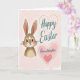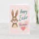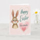 This greeting card features a soft, pastel pink watercolor-style background that feels light and airy, setting a gentle Easter mood 🌷. On the left, a cute animal character is shown from the chest up, with soft brown fur, large upright ears, rosy cheeks, and small black whiskers. Its wide, shiny eyes and slightly tilted head give it a tender, friendly look, like it’s leaning in to share a sweet moment 🐰. On the right, a festive Easter greeting appears near the top in teal lettering, centered inside a thin golden heart outline. Beneath that, a larger blush-pink heart shape holds a smaller, deeper rose-colored heart, suggesting a close bond through the way the shapes nest together. A short dedication sits inside the inner heart in a darker tone that stands out against the rose color. The final detail is a soft wash of pale pink behind everything, with subtle watercolor texture and faint speckling around the hearts and text.