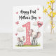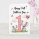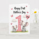 This Mother's Day card features a soft digital illustration on a white background that marks a first-time celebration with gentle charm. Near the top, the text “Happy First Mother’s Day” sits centered in a dark gray tone, floating above the scene like a quiet greeting. In the lower middle, a large light-pink number “1” with small white dots anchors the layout, giving the moment a sweet, celebratory focus ❤️. On the right, a larger gray baby elephant sits with a tender, watchful expression, holding a pink heart-shaped balloon that reads “2026” in darker lettering. On the left, a smaller elephant stands close by with rosy cheeks and wide eyes, as if leaning in toward its companion in a cozy, affectionate way 👩. A thin strip of green grass runs along the bottom, grounding the pair while soft clouds drift above them. Small pink butterflies flutter around the elephants and near the lettering, adding light movement against the open white space. The heart balloon is a warm pink with the year “2026” printed clearly at its center.