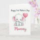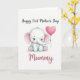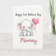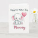 This card features a sweet baby elephant in soft gray, with pink inner ears, rosy cheeks, and tiny pink toe pads that make it look extra cuddly ❤️. Its big, shiny eyes and small brows face forward with a gentle, trusting look, and the curled trunk adds a friendly, affectionate touch. Floating beside its head is a glossy heart-shaped balloon in bright pink, held by a thin string that rises lightly through the open space. The background stays very light and simple, so the elephant and balloon feel like they’re sharing a quiet moment together. Near the top, the phrase “Happy First Mother’s Day” is placed in a dark color with smooth, flowing lettering. Near the bottom, “Mummy” appears larger in pink to match the balloon, giving the layout a balanced, tender feel 🌼. Soft shading rounds the elephant’s body, and a small highlight on the balloon makes it look shiny against the pale backdrop. The balloon sits to the upper right of the elephant’s head, with the string curving down along the side of its face.