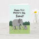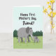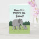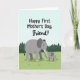 This card shows a gentle outdoor scene with two gray elephants standing close together on a bright green field, their bodies angled so they seem to share a quiet, friendly moment ❤️. The larger adult stands on the left while the smaller calf stands to the right, mirroring the same rounded features and calm posture. Their trunks curl toward each other and touch softly, like a caring nudge that suggests support and affection between friends. Across the top, the message “Happy First Mother’s Day, Friend!” is placed in a flowing black handwritten-style font, centered above the animals. The background keeps things light with a pale blue sky that fills the upper half of the design. Along the horizon sits a simple row of dark green cone-shaped trees, adding a peaceful park-like setting 🌼. The ground is a smooth wash of lime green that runs beneath their feet, making the gray figures stand out clearly. The adult elephant’s trunk arcs downward in a neat curve to meet the calf’s raised trunk, with the text floating above them against the open sky.