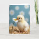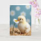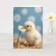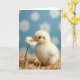 This design shows a fluffy pale-yellow chick leaning toward a single white daisy, its small orange beak hovering close to the flower’s sunny yellow center as if sharing a quiet secret ❤️. Soft, diffused light falls across the chick’s down and the daisy’s petals, giving the scene a gentle, cozy glow that feels like a tender moment between new friends. The chick’s large dark eye is turned toward the bloom with a curious, affectionate look, as though it’s captivated by the daisy’s calm presence. A bed of golden straw fills the lower area, adding warm texture beneath the delicate subjects. In the upper area, a sky-blue background fades in with faint, blurry white floral shapes that echo the daisy and keep the focus on the close interaction. Any greeting text would sit neatly along the top in a soft gray or muted gold, with a smaller line near the bottom in a lighter tone to keep the image airy 🌼. The daisy rises on a slender green stem from the straw, angled slightly toward the chick’s face against the cool blue backdrop.