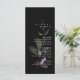 Delicate floral arrangements, subtle arch outlines, and modern sans serif fonts in a color palette of lilac, mauve and soft sage green, combine with black and white backgrounds to give the pieces in this elegant wedding suite a moody, romantic ambience. The narrow reception menu card shown here provides a template to easily add your own menu selections. Search ID998 to see the complete collection.