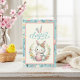 This sweet pastel colored Easter card features a cute little bunny rabbit in a wreath of flowers while holding a cute pink colored decorated Easter egg. The words "Happy Easter" are in a blue and pink vintage-style graphic with bunny ears on top. Personalize by customizing the message on the inside and/or adding your names - or leaving that part blank if you wish to add handwritten signatures later.