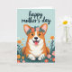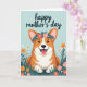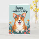 This greeting card features a cheerful, short-legged dog with amber-and-cream fur standing low in the scene, its alert ears lifted as if listening for a familiar voice. A small wreath of coral and soft pink blossoms with leafy greens rests on its head, adding a gentle, affectionate touch ❤️. The dog’s wide eyes and open smile, with a pink tongue showing, give it a friendly look that feels like it’s greeting someone it adores. Behind it, a light blue sky holds scattered golden stars and faint white cloud streaks, creating a calm, dreamy setting. Along the bottom, deep green grass is shaded in a few tones, and simple flowers in orange, coral, and pale pink rise around the dog like a garden arranged for a sweet meetup 🌼. Across the upper area, a dark-colored message is placed prominently, centered so it stands out against the pale sky. The floral crown’s petals appear in small clusters, with tiny green leaves peeking between the blossoms near the dog’s ears.
