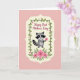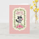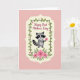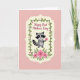 Designed with a sweet, romantic touch, this card features a stylized gray creature with dark mask-like markings and a ringed tail, holding out a single bright pink flower as if offering it to someone special ❤️. The character sits centered inside a cream-colored frame with softly scalloped edges, making the moment feel intimate and gently celebrated. Around the frame, a thin green vine winds along the border with small rosy star-shaped blossoms tucked between the leaves. The background is a light pastel pink wash that keeps everything soft and affectionate, like a quiet exchange between friends. Near the top, a short message appears above the framed character in dark, flowing lettering, standing out clearly against the pale backdrop. Beneath the character, a small bouquet of larger fuchsia flowers with deep red centers and green foliage adds a cheerful pop of color 🌼. The cream frame, vine border, and floral accents are neatly arranged so the eye moves from the top text down to the offered bloom and the clustered flowers below. The striped tail curves to one side while the pink blossom is held forward at the center of the frame.