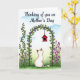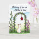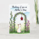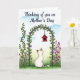 This card features a calm, cream-colored cat with light brown markings on its ears and tail, sitting from behind near the lower middle as if quietly keeping someone company ❤️. Its head tilts upward toward a bright red little birdhouse hanging inside a leafy arch, creating a gentle, romantic pause in the scene. The arch is formed by curling green vines dotted with many small, star-shaped purple flowers, like a natural doorway framing the view. A single vine climbs up the left side, while a soft cluster of pinkish-purple wildflowers gathers on the right, adding a cozy, friendly balance. The colors feel like a soft watercolor wash, with green ground fading into a pale blue sky with faint, cloudy touches. Near the top, a short message is placed above the arch in a dark ink tone that stands out without overpowering the art, with a small 🌼 nearby. The red birdhouse has a simple roof and round opening, hanging at the center of the vine arch against the light blue sky.